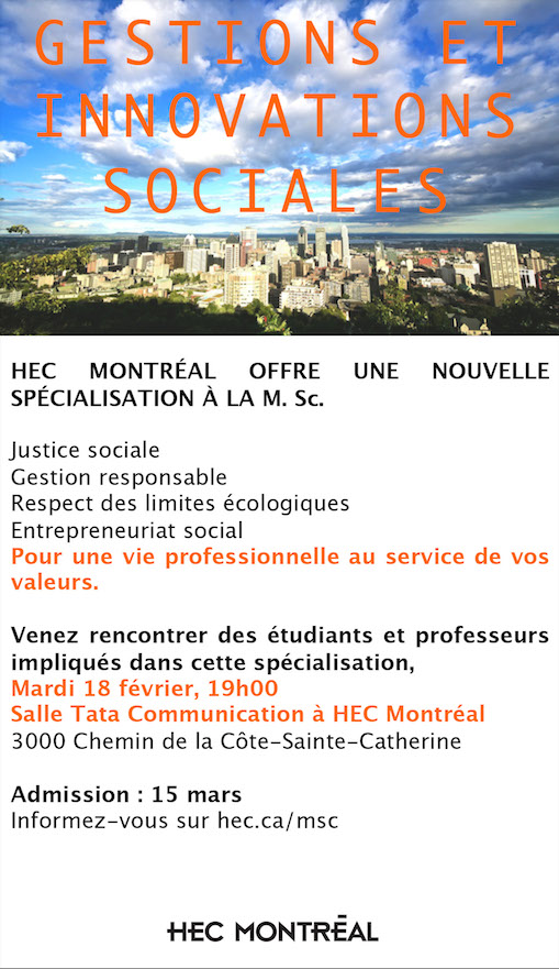 Une nouvelle spécialisation voit le jour à la M.Sc à HEC Montréal : "Gestions et innovations sociales". Dirigée par le professeur Yves-Marie Abraham, elle fournit un cadre d’analyse et des outils adaptés aux problématiques de justice et de transformations sociales. Pour qui veut comprendre et intervenir de façon judicieuse, comme acteur ou analyste, dans des organisations communautaires, coopératives, syndicales, humanitaires…